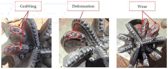 Large deformations were observed to the nose cutters of bit during the drilling of Well-1 in Algerian hydrocarbons field. Data collected from the ‘BlackBox’ vibration tool show the appearance of three types of vibrations. Moreover, the damages are mainly located in the nose cutters (wear, grabbing, deformations, etc.) [31]. These damages are essentially due to the torsional vibrations which cause the bit to stop and then release simultaneously. This periodic cycle causes the bit and the geological formation to come into contact at very high speeds, thence, small damages or cracks take place. As the cycle repeats with high frequency, these small damages become significant and important, and as a result, large deformations appear as shown in Figure 13. Simulation results have shown the appearance of wide fluctuations in bit speed, which are better suited to field data.