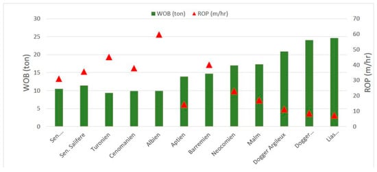 BlackBoxTM shows the values of WOB and ROP during the drilling operation, the difference between these data and simulation is that the influence of geological layer is included in the recorded data, while in the simulation this parameter has been manipulated [31]. Both data collected (Figure 14) and simulation results (Figure 12c) show the influence of WOB on the rate of penetration.