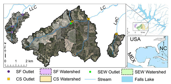 Falls Lake serves as the main water supply for the City of Raleigh and provides primary and secondary water-based recreational activities for the region. Raleigh serves as the county seat for Wake County, which ranks among the top 50 counties in the United States for population growth and it gained approximately 65 new residents each day from 2010 to 2017 [25]. Sustainable management of water resources is vital for continued growth and economic development in the region. Falls Lake and many of its tributaries, including Lick Creek and Little Lick Creek, are designated as impaired waters [26]. Lick Creek and Little Lick Creek have watershed restoration plans designed to improve water quality within their respective watersheds. These plans suggested that failing septic systems and surface discharging systems (i.e., SF-type systems) could be significant sources of wastewater constituents (e.g., nutrients, bacteria, oxygen-demanding substances) and contributors to aquatic habitat degradation in Lick Creek and Little Lick Creek [27,28]. The technology used for wastewater treatment (e.g., SF, CS, SEW) varied in different sub-watersheds of Falls Lake. Some areas were served mostly by CS, some mostly by SF, and others by SEW. Water quality monitoring data were not available for many of the sub-watersheds served by these different technologies, so more information was needed to determine if the wastewater treatment approach and/or septic system density affected water quality.