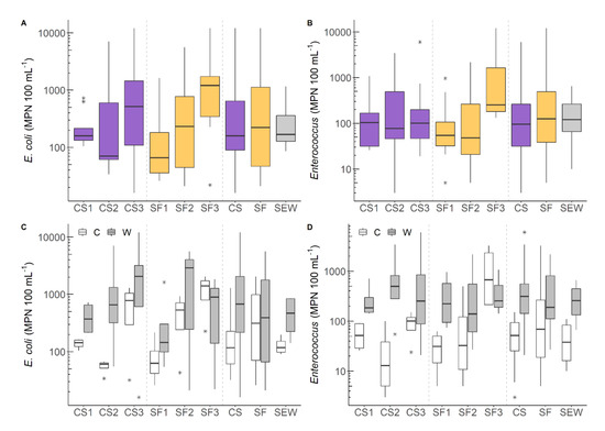 Concentrations of Escherichia coli and Enterococcus spp. from watersheds grouped by wastewater treatment approach (A,B) and comparison of cold (C) vs. warm (W) months showing increased fecal indicator bacteria during warmer months (C,D). Pooled data are shown for each group as CS = conventional septic; SF = sand filter; SEW = sewer. The asterisks (*) denote outliers.