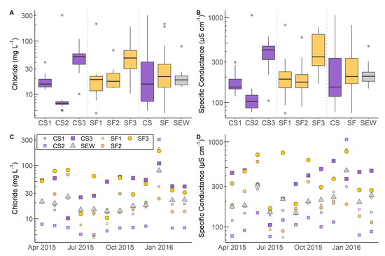 Specific conductance and chloride data in the CS3 and SF3 watersheds were also elevated relative to the other watersheds (Figure 3; Table 3), potentially indicating wastewater effects [45,46]. These differences were statistically significant for both specific conductance and chloride at p < 0.01. Waters downgradient from wastewater inputs tend to contain elevated specific conductance and chloride [45,46]. Furthermore, elevated specific conductance in water may indicate a continuous source of dissolved ions, such as septic systems, and increased septic system densities are often associated with elevated specific conductance [47,48]. Past studies [45,46,49] reported specific conductance and chloride values ranging from approximately 500−2000 μS cm−1 and 50–300 mg L−1, respectively, in wastewater, which were similar to values reported in the CS3 and SF3 watersheds (Figure 3; Table 3). The other watersheds in the current study contained similar specific conductance (approximately 30–250 μS cm−1) and chloride (approximately 10 mg L−1) values to groundwater and surface water unaffected by wastewater inputs reported in Birch et al. [46]. Runoff from roads treated with salt to prevent ice accumulation during winter weather can contain specific conductance and chloride values up to approximately 10,000 μS cm−1 and 8900 mg L−1, respectively [49]. Road salts are not routinely applied throughout winters in the study area due to milder winters yielding infrequent snow and ice storms. However, the January 2016 sampling event occurred several days after a snowstorm hit the area when road salts were likely used, thus explaining the larger variability and sudden increase in chloride and specific conductance in all watersheds (Figure 3).