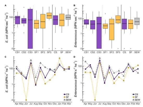 Boxplots (A,B) and time series plots (C,D) of area-normalized watershed exports of E. coli and Enterococcus spp. Time series plots illustrate median exports of bacterial loadings. Data ranged from April 2015 to March 2016. During summer months, flow occasionally ceased, resulting in no transport of bacteria. The plus symbol (+) denotes outliers.