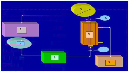 Technical scheme of ultrafiltration-dynamic mode: 1—pectin isolate volume, 2—pump, 3—mechanical filter, 4—membrane filter, 5—manometer, 6—tap, 7—filtrate volume.