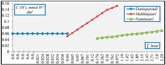 It was found that the productivity of the process of ultrafiltration of the Danisparauli water decreased over time and remained unchanged during filtration of the Makhinjauri and Naminauri waters. In permeate (filtrate) and concentrate, obtained as a result of filtration, a chemical analysis of the water was carried out. The titratable acidity data are presented in Figure 6.