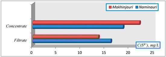 In sulfur-containing waters, the content of sulfide (S2−) ions was determined in the filtrate and concentrate (Figure 7).