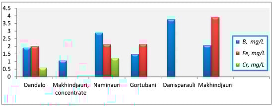 Figure 9 presents data on the content of chromium, boron and iron in the mineral waters of Adjara, as well as, for comparison, data on the content of these metals in the waters of another region—Adigeni, Naminauri and Gortubani.
