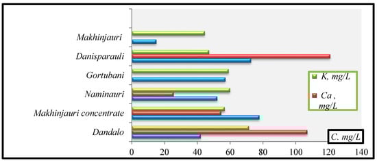 - K(mg/L): Makhinjauri (44.5)→Danisparauli (47.1)→Makhinjauri concentrate (56.6)→Gortubani (59.0)→Naminauri (59)→Dandalo (71.4);