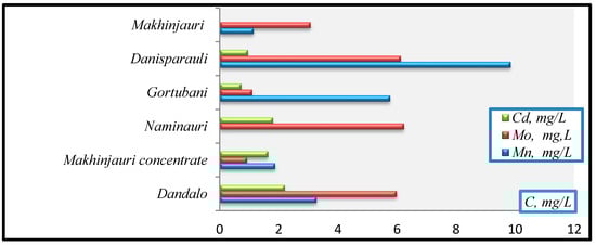 - Mo (mg/L): Makhinjauri concentrate (0.918)→Gortubani (1.09)→Makhinjauri (3.07)→Dandalo (5.98)→Danisparauli (6.12)→Naminauri (6.23).