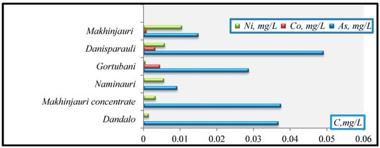 - Ni(mg/L): Gortubani (0.0005)→Dandalo (0.0014)→Makhinjauri concentrate(0.0033)→Naminauri (0.0056)→Danisparauli (0.0058)→Makhinjauri (0.0105);