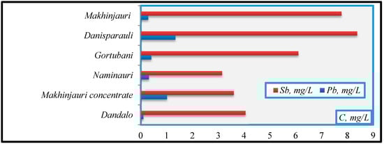 - Sb (mg/L): Naminauri (3.15)→Makhinjauri concentrate (3.6)→Dandalo (4.06)→Gortubani (6.1)→Makhinjauri (7.77)→Danisparauli (8.38);
