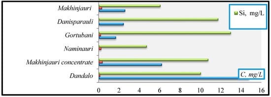 - Si (mg/L): Naminauri (4.73)→Makhinjauri (6.07)→Dandalo (10.05)→Makhinjauri concentrate (10.77)→Danisparauli (11.75)→Gortubani (13).