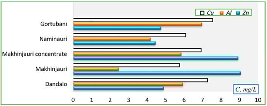 - Al (mg/L): Makhinjauri (2.46)→Naminauri (4.19)→Dandalo (5.65)→Makhinjauri concentrate (5.85)→Gortubani (6.97)→Danisparauli (8.16).