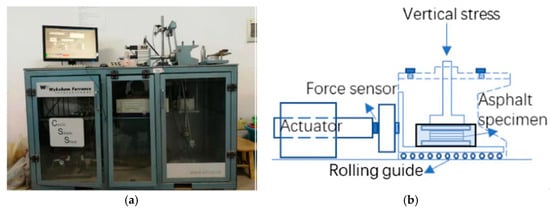 The purpose of this test was to investigate the damping properties of HCC-modified asphalt, which is used in low-cost spring-asphalt isolation bearings. The whole test was conducted in the structural experiment center at Hunan University. The experimental instrument is the cyclic simple shear system developed by the Wykeham Farrance company (see Figure 1a), and the schematic is shown in Figure 1b. The specimen used in the test is a round column with a diameter of 70 mm and a height of 25 mm (see Figure 1c). The material properties are shown in Table 1.
