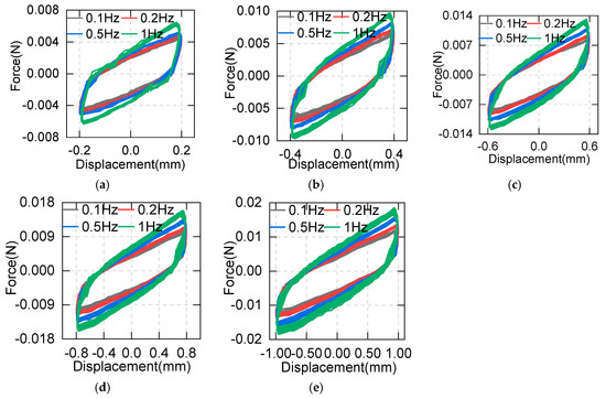 Hysteretic curves of the asphalt specimen under different loading frequencies at 20 °C: (a) maximum displacement of 0.2 mm (maximum strain of 1%); (b) maximum displacement of 0.4 mm (maximum strain of 2%); (c) maximum displacement of 0.6 mm (maximum strain of 3%); (d) maximum displacement of 0.8 mm (maximum strain of 4%); (e) maximum displacement of 1 mm (maximum strain of 5%).