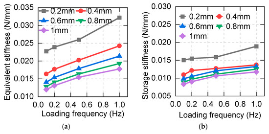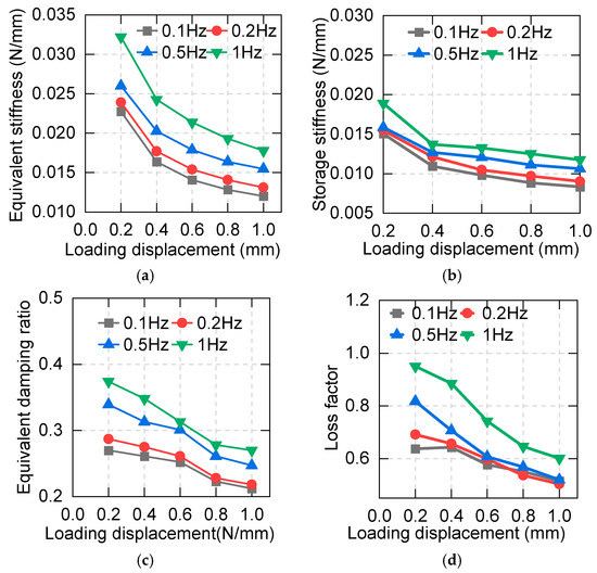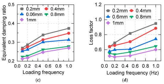 To reveal the effect of the loading frequency on the asphalt energy dissipation capacity, the storage stiffness (Ke), equivalent stiffness, loss factor (η), and equivalent damping ratio for the same displacements are plotted in Figure 5. It is apparent that all four parameters increase with increasing frequency.