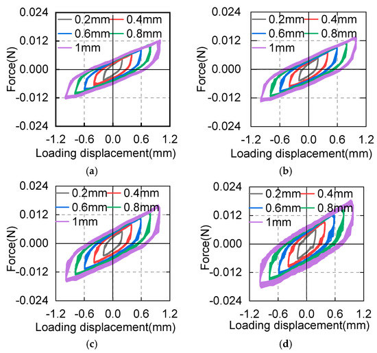 Hysteretic curves of the asphalt specimen under different loading displacements at 20 °C: (a) loading frequency of 0.1 Hz; (b) loading frequency of 0.2 Hz; (c) loading frequency of 0.5 Hz; (d) loading frequency of 1 Hz.