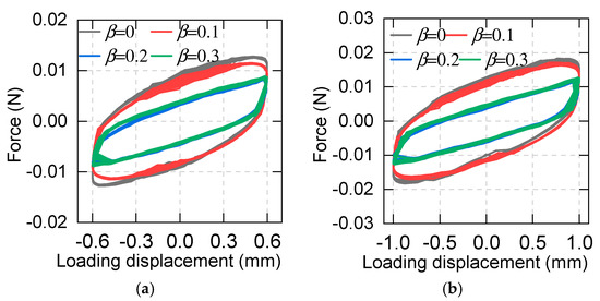 Hysteretic curves of the asphalt specimen under different temperatures at 0.1 Hz: (a) maximum displacement of 0.4 mm; (b) maximum displacement of 0.6 mm.