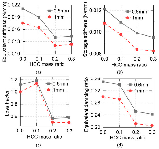 Dependence of the damping properties of asphalt on the HCC mass ratio with a temperature of 20 °C and a loading frequency of 0.1 Hz: (a) equivalent stiffness; (b) storage stiffness; (c) loss factor; (d) equivalent damping ratio.