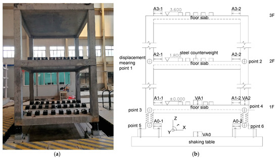 Horizontal acceleration sensors were set on both sides of each floor, and vertical sensors were installed at the center and corner of the first floor. Video image processing technology was used to record the displacement of the observed points in the XZ plane (see Figure 12b).