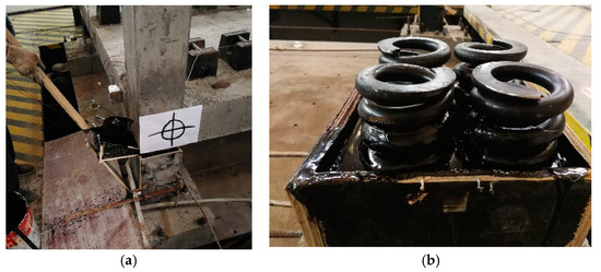 Pouring the asphalt into the isolation bearings: (a) the procedure; (b) the isolation bearing with asphalt.