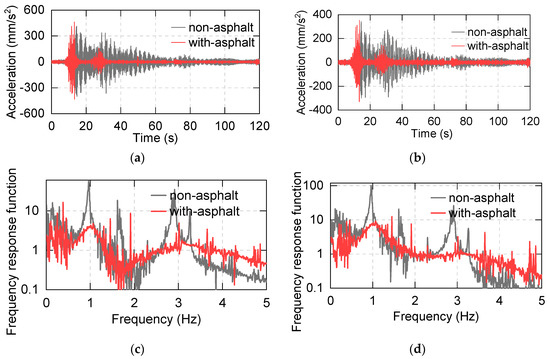 - The results of the modal analysis of the shaking table indicate that the damping effect is pronounced. Compared with non-asphalt tests, the duration and peak value of the acceleration responses in the with-asphalt tests are reduced by varying degrees, and the displacement is reduced to about 50% of that in the non-asphalt test.