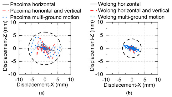 The displacements of measuring point 1 in the XZ plane are shown in Figure 16 and Figure 17. The results show that the vertical ground motions do not change the horizontal displacements significantly, whereas rocking ground motions can significantly increase the responses of the horizontal displacements. Furthermore, when the asphalt is added, the horizontal and vertical displacements are reduced by about 50%.