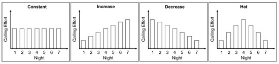 Schematic of four female moth calling strategies, expressed as female calling effort over a typical seven night call. Calling effort is quantified as the time females spent calling males and/or the pheromone titer.