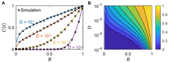We find that the analytical expression in Equation (5b) and our simulation results are in good agreement for all surveyed values of D and , as shown in Figure 3A, for the specific choice s. The dimensionless is plotted on the horizontal axis of Figure 3A instead of for compactness. Larger values of indicate moths that are initiated closer to the stationary plume, whereas smaller values of indicate moths that are initiated further away from the female. A contour plot for the numerical capture and mating probability at time as a function of D and R is shown in Figure 3B. Increasing the simulation time yields capture and mating probabilities that approach one.