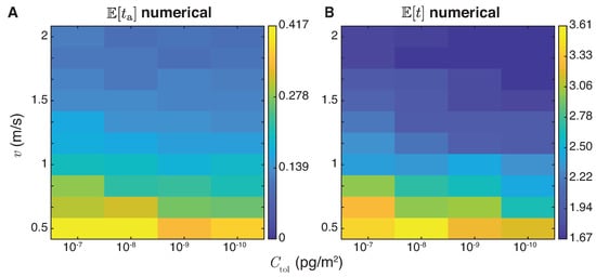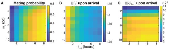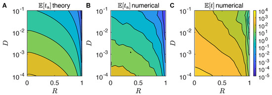 Male arrival time distributions evaluated in phase space, where . (A) Mean first arrival times calculated from Equation (13a) for moths. (B) Mean first arrival times calculated from numerical simulations with arrivals and s (Section 4.1). (C) Mean arrival times calculated from numerical simulations. Mean first arrival times are the lowest for large diffusivities D and for , as can be expected. Note the nine orders of magnitude variation for across the ranges considered. The mean arrival time is generally much larger than and only spans three orders of magnitude in the same space.