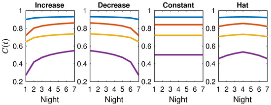 Four possible categories of female calling patterns were considered in Umbers et al. [17]: constant (the calling effort is the same every night), increase (it is greater each night compared to the night before), decrease (it is less each night compared to the night before), or hat (it increases to a peak amount and then decreases). Among those studies that measured the time that females spent calling, approximately 70% reported that the effort followed the increase pattern, 15% reported the hat pattern, 9% reported the decrease pattern, and 6% reported the constant pattern. For studies that measured pheromone titer, approximately 40% reported that the effort followed the hat pattern, 34% reported the decrease pattern, 16% reported the increase pattern, and 10% reported the constant pattern. Due to variability, our models account for changes in both the time spent calling and the pheromone titer. A schematic is shown in Figure 1.