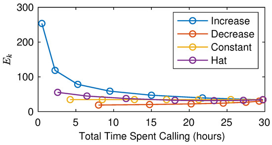 For each of the k nights, with , we denote the time spent calling by , while the radius of the circular plume per call is fixed at . Regardless of female strategy, the values of are chosen between a minimum of 0.5 and maximum of 8 h as reported in Section 2.1 from previous experimental observations, such that the total allotted total calling time does not change among strategies. For , we thus consider
