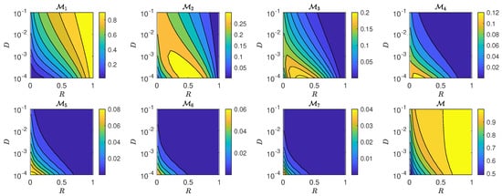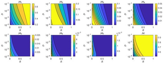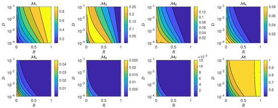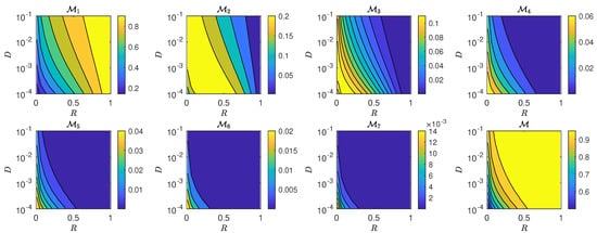 For most D and R parameter values, simulating arrivals is straightforward since the capture/mating probability is relatively large; however, for those parameter values with small , many simulations are required. When s, . Thus, we choose the maximum number of simulations to obtain approximately arrivals. From these arrival times, we then simply obtain the minimum and average values.