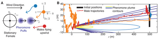 We utilize a two-dimensional setting with female and male moths located on the same plane at a fixed altitude based on the observed lack of male vertical motion in experimental studies, as discussed in Section 2.2. We also model the concentration of female-emitted plume as a two-dimensional field. This quantity varies in space and time, and it is a function of wind currents and female emission activity. A male moth is assumed to be able to detect the plume if is larger than a given threshold , a value that indicates male chemosensitivity to pheromone and is a proxy for the length and/or elaborateness a male’s antenna, where longer/more elaborate antennae are able to sense smaller quantities of pheromone (Symonds et al. [64]).