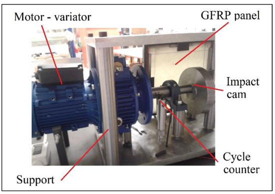 The reproductions of slamming impact were made with the equipment presented in Figure 2. It is composed of a variator-electric motor assembly coupled to a cam with a shaft supported by two flexible supports to dissipate the reaction energy of the cam when pressing the panel and protect the drive from possible excessive lateral loads. The cam is keyed while remaining fixed to the shaft and rotates between 200 to 320 RPM. The panel was installed at its base with gauge screws that allowed exerting pressures between 0 to 1200 kN/mm2 and the panel is adjusted crosswise to the cam. A revolution counter was installed, and the temperature control was carried out with a thermal imager, to avoid that the temperature does not reach the glass transition temperature of the material due to friction.