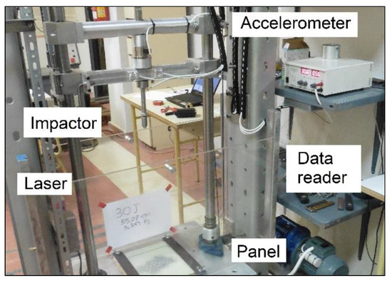 A machine for vertical weight drop testing was built. The impactor carriage falls by gravity on two chrome rails to reduce the effect of friction. The panels to impact were installed at its base, with all its edges embedded. It has an anti-bounce system with a laser reader to control the number of impacts. It has an acceleration sensor or gravitometer installed that sends the information to a data acquisition system and tabulates the acceleration G-force versus the time of impact. The equipment has a frame-shaped structure to which all parts are secured. The impactor was made with electromagnets for holding and launching. The guide bolts allow more weight to be added to it. At the bottom of the impactor it has the impact tip with a magnetized sphere. The number of impacts is controlled with a laser reader. Figure 5 shows the detail of the impact equipment and its parts.