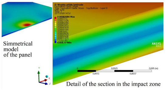 Using the Finite Element Method (FEM), the force that caused deformations equivalent to those that cause damage to the material was estimated in the model. Figure 8 shows the symmetric model with the load at its center and a detail of the section in the impact zone of the same model. The results of the elastic strain have been plotted for a value in the maximum impact zone of 834 µm/m corresponding to a pressure of 385 kN/m2.