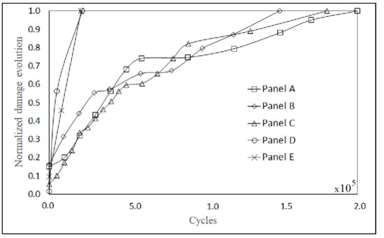 Normalized damage evolution on unmodified panels.