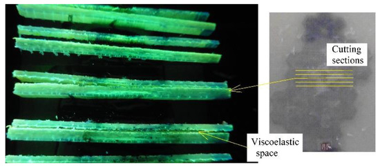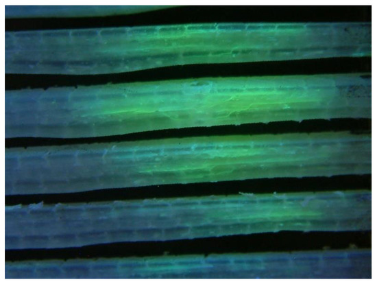 The modified panels were treated in the same way with fluorescent penetrating inks to assess the type of damage. During the cut, the viscoelastic sheet came off. This is seen in Figure 20. It should be noted that the viscoelastic layer came off due to the oil cut. The sections were 2 mm thick and despite the slow cutting speed, this affected their adherence. The cutting speed was very slow and oiled, to prevent fragments of composite material from sticking to the sections and showing erroneous results under fluorescent light.