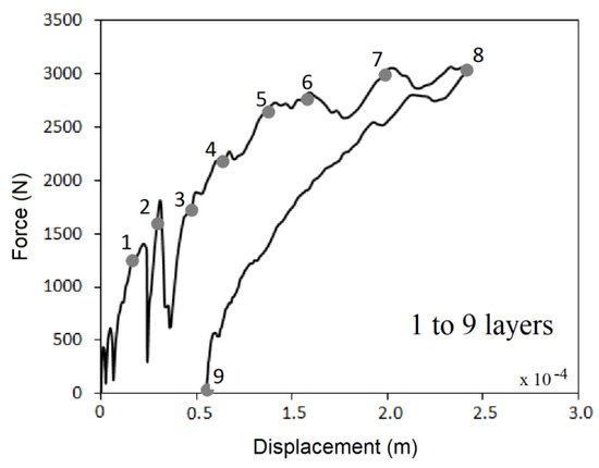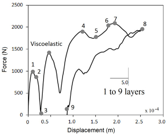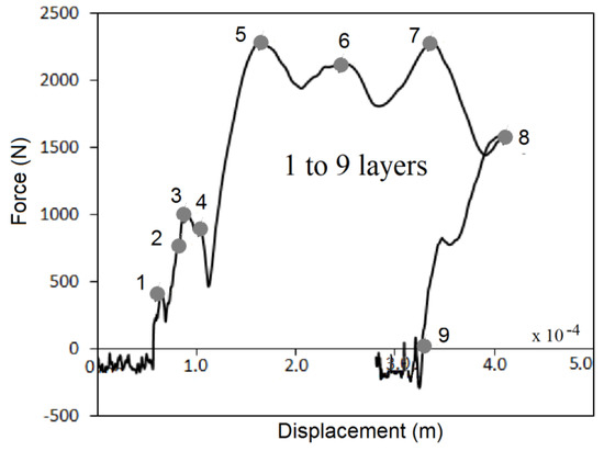 The accelerometer records the acceleration force (G), at a frequency of 104 Hz. According to the suggested equations, they show that the acting force versus displacement has the profiles presented in Figure 14 and Figure 15. The peaks of damage that occurs as the impactor breaks each of the layers. The impactor slows down each time a new delamination occurs. Records the acceleration variations when micro cracks occur in the matrix. In the case of the low energy impact of 30 Joules, the impact force reaches its maximum value by breaking layer 5. Thereafter the layers offer resistance to deformation. In the case of impact at 50 Joules of high energy, the impactor has enough force to continue breaking all the layers until 9 at which it has already bounced.