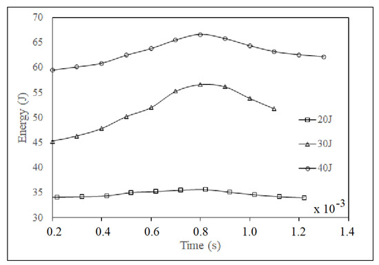 The assessment of the absorbed energy is observed in Figure 16 for impacts of 20, 30 and 40 Joules. The curves clearly show that the panel absorbs energy that is returned in the form of kinetic energy, and over a certain time interval its capacity to absorb energy decreases, indicating that there is more damage within the panel.