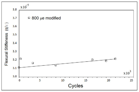 The change in flexural stiffness was evaluated with the results of the strain gage using panel F. In Figure 11 are the results of the for a deformation of 1 × 103 µm/m at the slamming pressure point in the 0.27 × 105 test cycles with a pressure of 420 kN/m2. The data has a representative ascending line, which indicates that as the micro cracks increase, the panel loses rigidity. This is in accordance with the type of damage observed on the panel on the opposite side of the impact. These values were calculated from the deformations obtained with the strain gages.