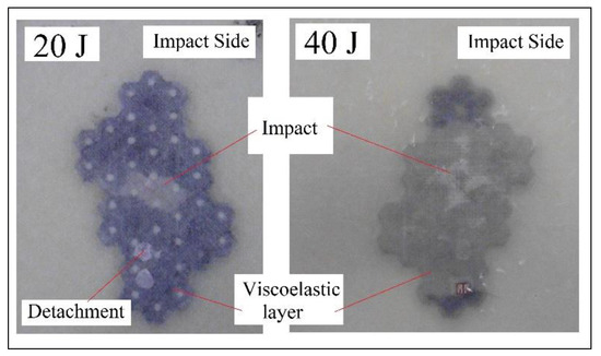 The tests carried out on the panels with a viscoelastic layer with impact energies for weight drop of 20 and 40 Joules are shown in Figure 19. The impact of 20 Joules presents little damage on the surface with little failure of adhesion with the laminate matrix. In contrast, in the 40 Joules panel, the damage is much greater and there is a complete cradle separating the viscoelastic lamina with the matrix. The impact is punctual and there is a noticeable difference with the high energy slamming test. The vertical weight drop tests obtained similar results for the low energy case. Over 30 Joules the data obtained is applicable for a comparison.