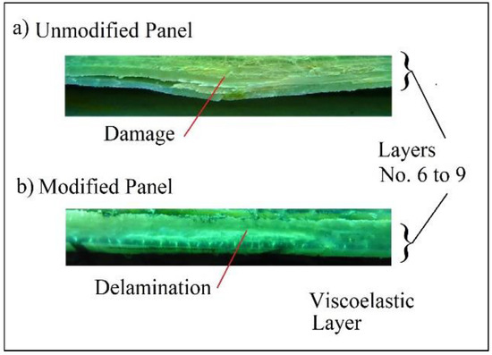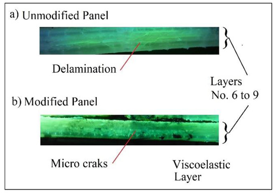 The characterization by fluorescent penetrating inks, allowed us to physically observe how the damage does not propagate in the same way under the layers of the viscoelastic sheet, mixing this damage between the impact shock and the normal tension due to the flexion of the panel on the tensile side. Figure 27 shows two cut sections in the impact area already characterized by an unmodified and a modified panel, both impacted at 40 Joules. In the panel without modifying the interlaminar and intralaminar damages, they are linked, producing internal breaks in the laminate between layers 5 and 9 with important separations to the matrix. On the other hand, in the modified panel, the viscoelastic sheet protects the section of the laminate between layers 6 and 9, which correspond to those subsequent to the sheet. This means that it has returned the energy of damage and therefore little damage is observed on the underside, corresponding to microcracks and no delaminations.
