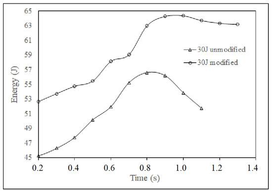 The absorbed energy curve that has the best configuration is the 30 Joule curve, while the 60 Joule curve has an uncharacteristic trend, which is correctly related to the detachment and breakage of the matrix and the fiber that was observed in the test.