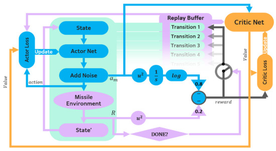 An aspect of the case that satisfies the Time Out condition while Out of Range condition is not satisfied is the maneuver in which the missile is approaching infinitely in spiral trajectory, which made us aware that the magnitude of the cost was becoming too big. Thus, we considered the maneuvers as outliers and gave them the lowest score and stored them to the replay buffer. The overall structure of the RL missile simulation is shown in