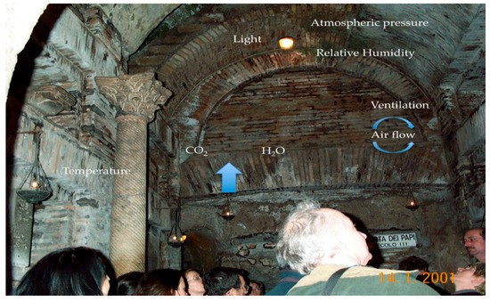 Example of physicochemical parameters affecting an indoor environment. The presence of visitors requires lights and produces an increase of temperature, relative humidity, and release of CO2, dramatically changing the delicate equilibrium of these environments. The image shows the Crypt of Popes in St. Callistus Catacombs, Rome, Italy, during the CATS project (photo, C. Urzì).