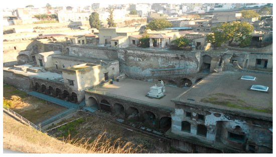 Example of outdoor archeological area. Remains of the antique Roman town of Ercolano (Naples, Italy). In general, outdoor environmental parameters such as sun irradiation, rain, raising humidity, wind, etc. can only be partially controlled due to the different exposition and the extension of the area. Indirect methods aim to keep environmental parameters in a range of acceptability. Image taken during the project POR Calabria FESR, project ‘‘NANOPROTECH’’ (NANO PROtection Technology for Cultural Heritage, J24E07000380005). (photo, C. Urzì).