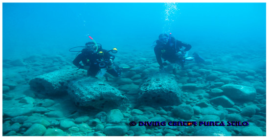 An example of submerged archeological items lying on the seafloor subjected to several underwater environmental factors such as sea current and the nature of the seabed. Biodeterioration is mainly due to the activity of micro- and macro-foulers depending on the position of the items (Photo, Alfina and Mario Tassone, Diving Center Punta Stilo, Calabria, Italy).