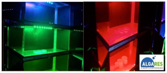 Monochromatic visible light [10] is a very safe, useful, and simple method to reduce or prevent the growth of photosynthetic microflora. The most used wavelengths are blue (λ 470–490 nm), green (λ 500–530 nm), and red (λ 680–700 nm) (Figure 4). If the intent is to block the photosynthetic process, it has to be considered that most of these microorganisms also have accessory pigments. Removal of these may require different wavelengths. In addition, they are ineffective against other kinds of microorganisms, unless photosensitizers (e.g., erythrosine-ERY) are applied [1]. In some cases, those that survive may grow on organic debris from dead cells that are left behind [5,11].