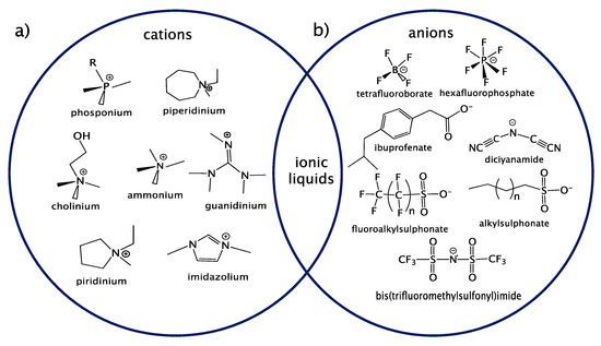 The majority of ILs are based on nitrogen or phosphorus cations (imidazolium, ammonium, piperidinium, phosphonium, etc.) (Figure 5a). The anions, which usually are employed as modulating agents of overall ILs properties (hydrophobicity, viscosity, etc.), may consist of simple halides (Cl−, Br−, I−), and organic and inorganic species (Figure 5b). Their widespread use has posed serious environmental concerns. Numerous studies have been carried out to establish ILs toxicity and biodegradability as functions of the cation and/or anion species [58]. The green credentials of ILs have been revised, giving rise to the so called “ILs of third generation” based on naturally occurring and/or biodegradable ions (for example, cholinium, morpholinium, aminoacids, drugs ions, etc.), which may have intrinsic biological and pharmaceutical activities [59,60,61].
